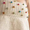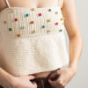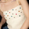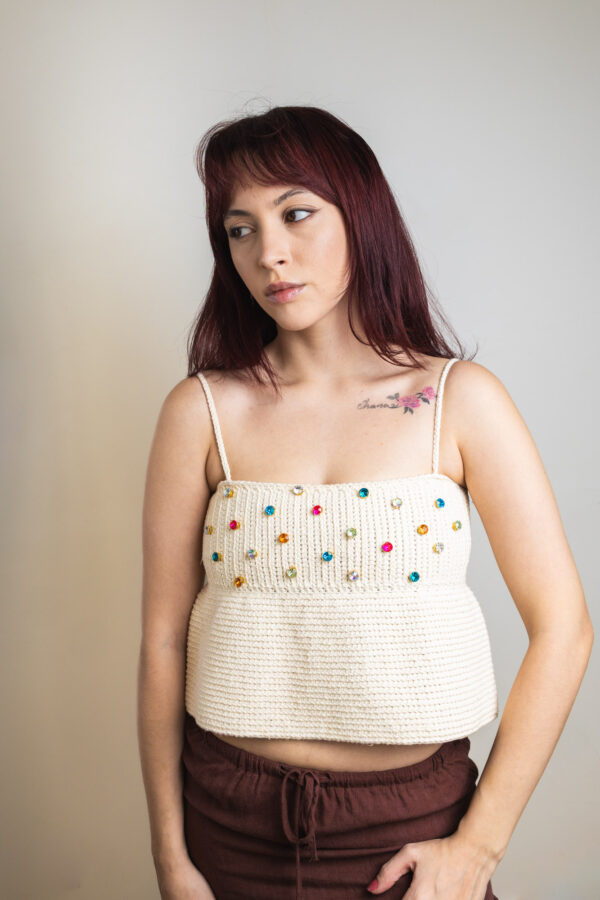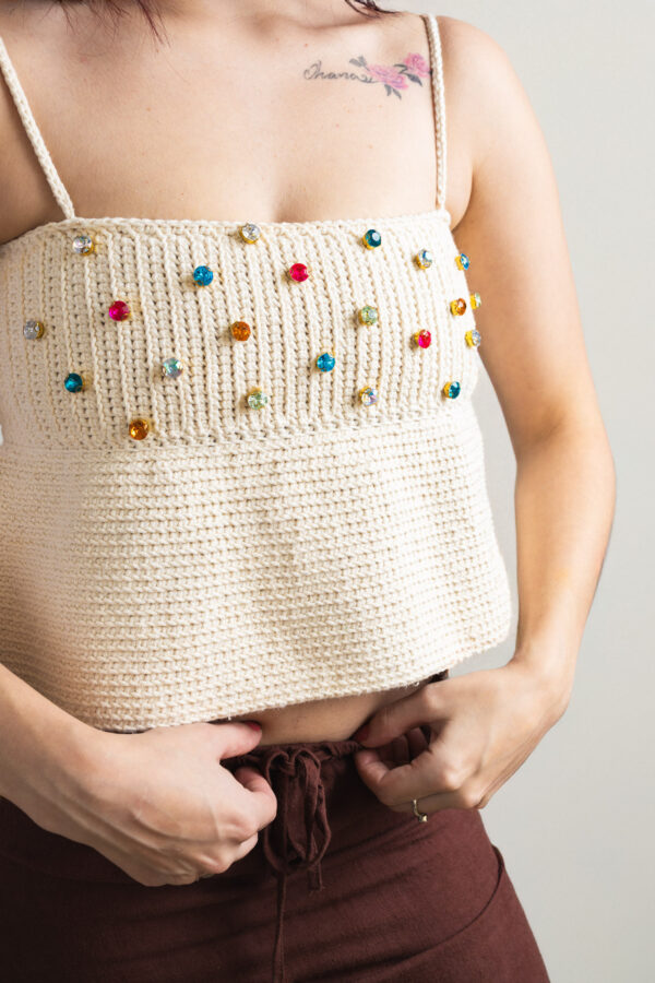 o top é feito com a técnica de crochê. usamos fio 100% algodão. busto bordado com strass colorido.
