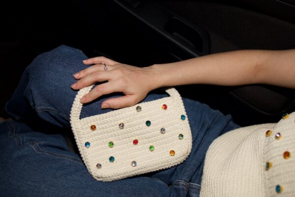 a sua bolsa de crochê com strass pode ser lavada à mão com sabão neutro e deve ser seca apenas à sombra.