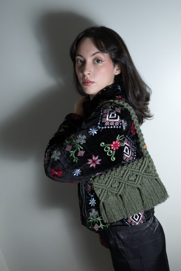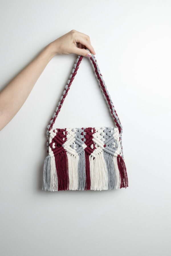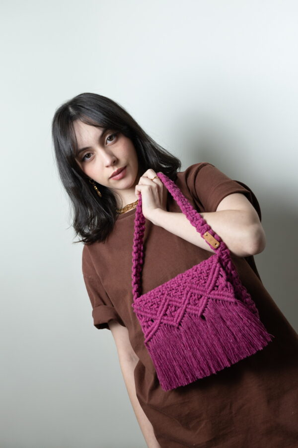 a bolsa é feita com a técnica de macramê. na bolsa vitória, usamos a linha spesso 24 fios, composta por 85% algodão reciclado e 15% outras fibras, sendo assim mais sustentável e ecológica. possui botão magnético.